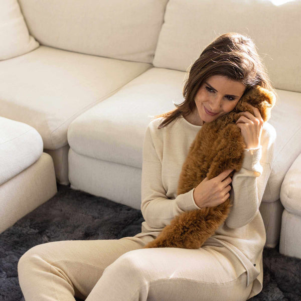Les alpagas sont des animaux extrêmement précieux. Leur laine est une matière première exquise et un cadeau noble de la nature. Pour l'obtention de nos matériaux, aucun animal n'est maltraité ; ni pour la laine de la tonte annuelle, ni pour la fourrure obtenue comme produit dérivé. Outre leur incroyable douceur, c'est la caractéristique unique de nos textiles. Avec nos produits éthiques, vous profitez d'un luxe naturel et durable.